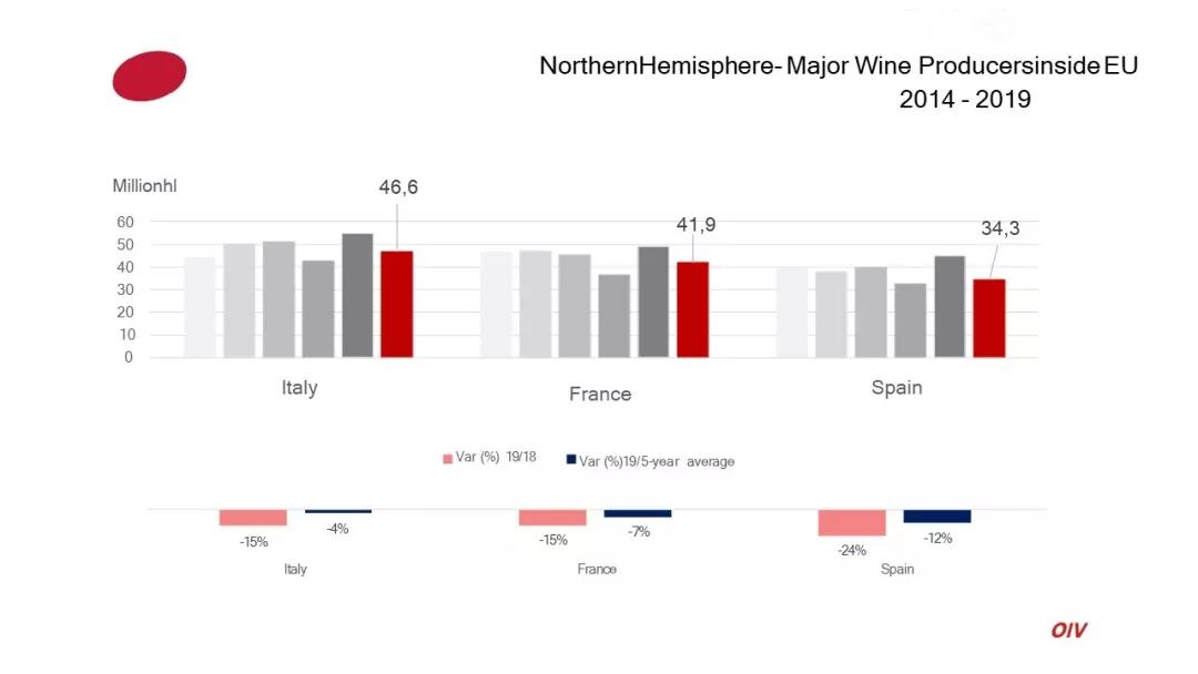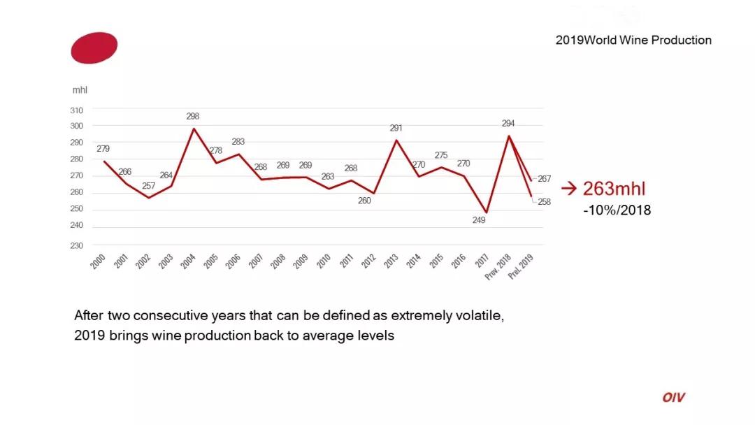 據(jù)國際葡萄與葡萄酒組織(OIV)最新數(shù)據(jù)顯示,2019年全球葡萄酒產(chǎn)量*為263億升(mhl),同比2018年下降了10.54%。包括法國、意大利、西班牙在內(nèi)的葡萄酒主產(chǎn)國產(chǎn)量均有不同程度下降。