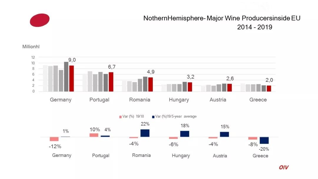 歐盟國家2019年葡萄酒產(chǎn)量156億升(mhl),占據(jù)全球葡萄酒產(chǎn)量的60%,略低于2014-2016年平均水平。