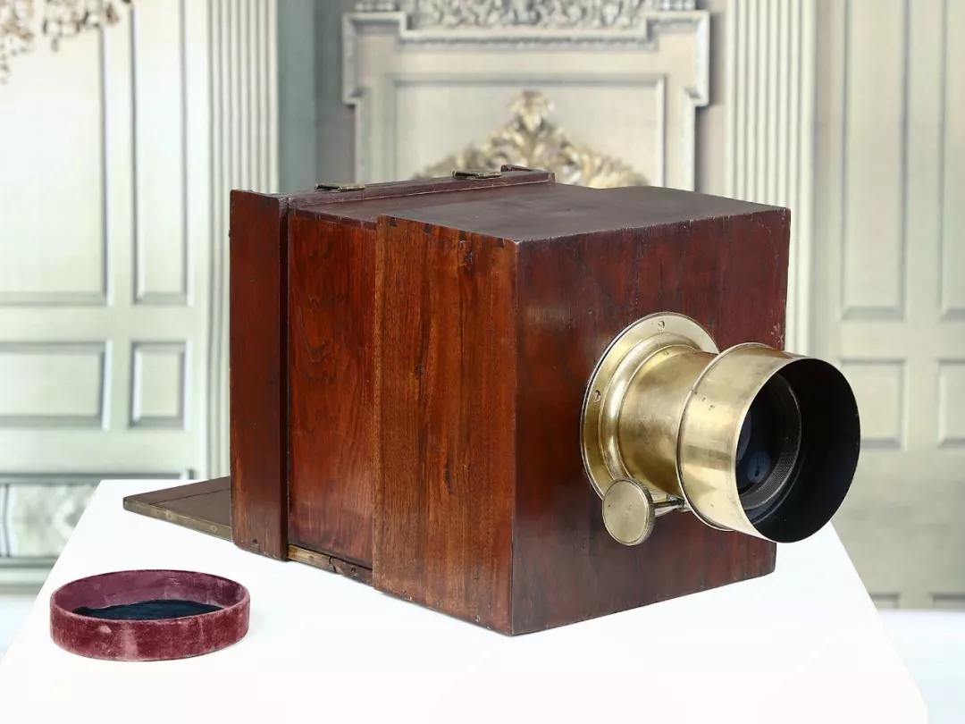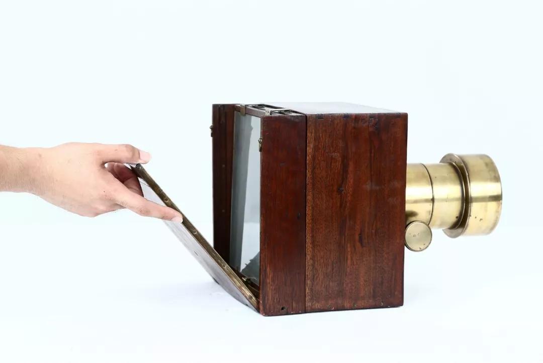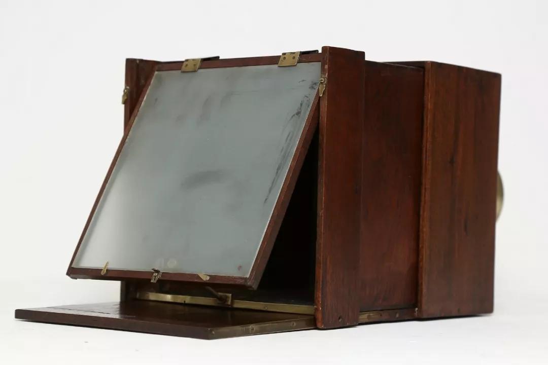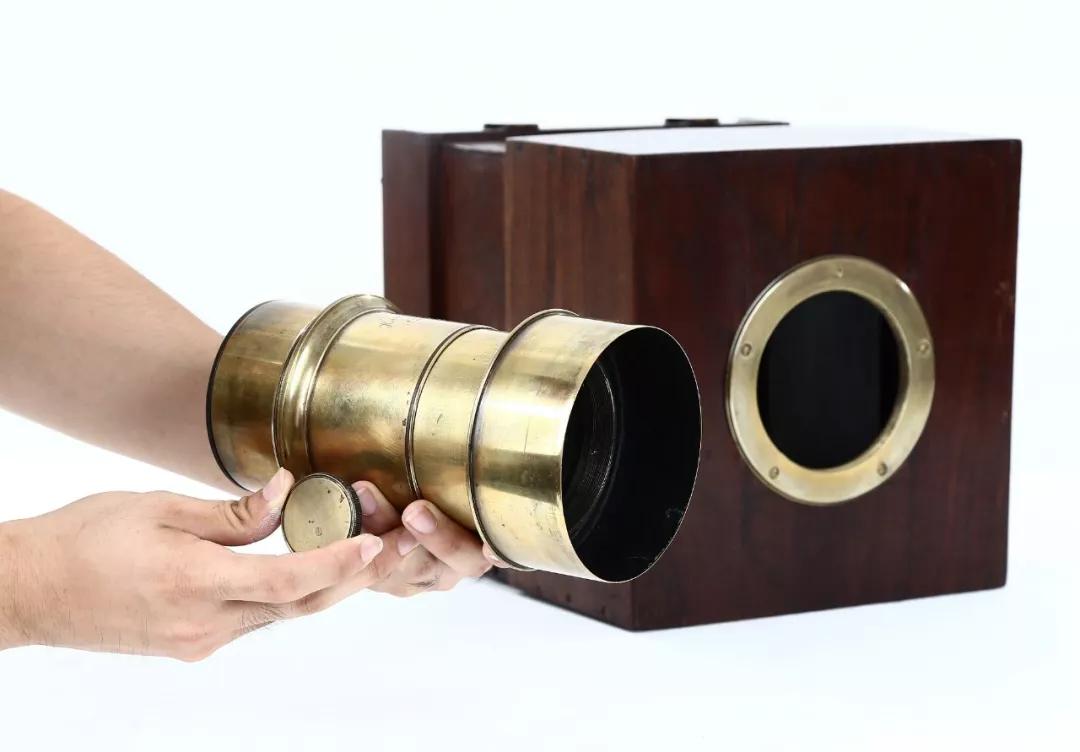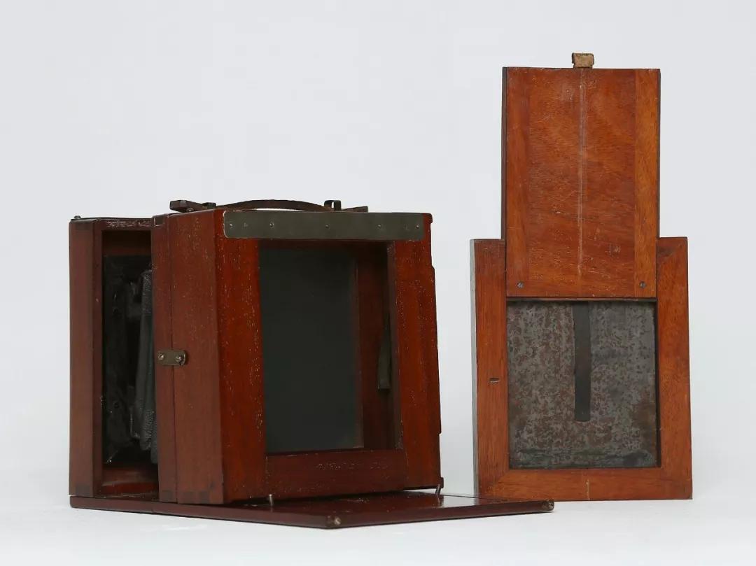 如果按機身材料分類,有木制和金屬制兩種;如果按調(diào)焦方式分類,有固定基座滑箱式、尾板滑箱式和皮腔折疊式多種;如果按照片形式分類,有普通照相機、立體照相機(1852 年法國人阿基利·基內(nèi)首創(chuàng),畫幅 120×240mm);如果按畫幅分類,既有6.5×8.5 英寸全版的,也有半版、1/4 版甚至 1 英寸畫幅的。