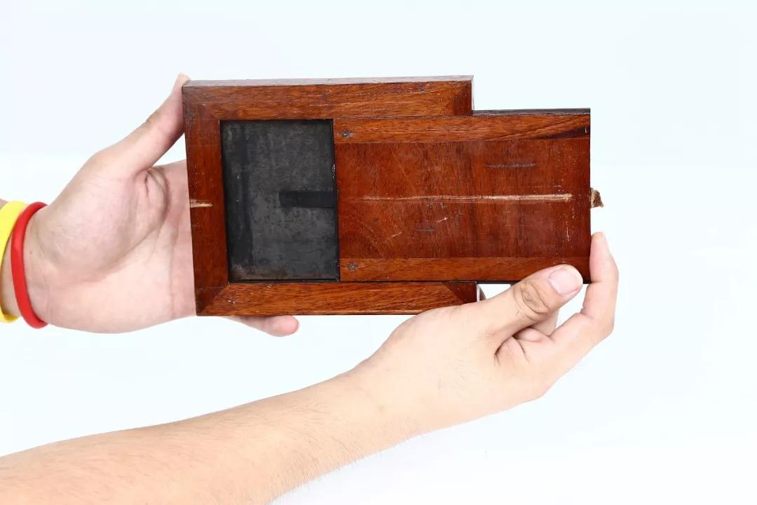 本人有幸收藏了這樣一臺尾板式滑箱照相機(圖02)。這臺相機是 1841-1842 年間在法國生產(chǎn)的,機身由胡桃木制成,尾板式滑箱結(jié)構(gòu)(圖03),金屬配件均為黃銅制。