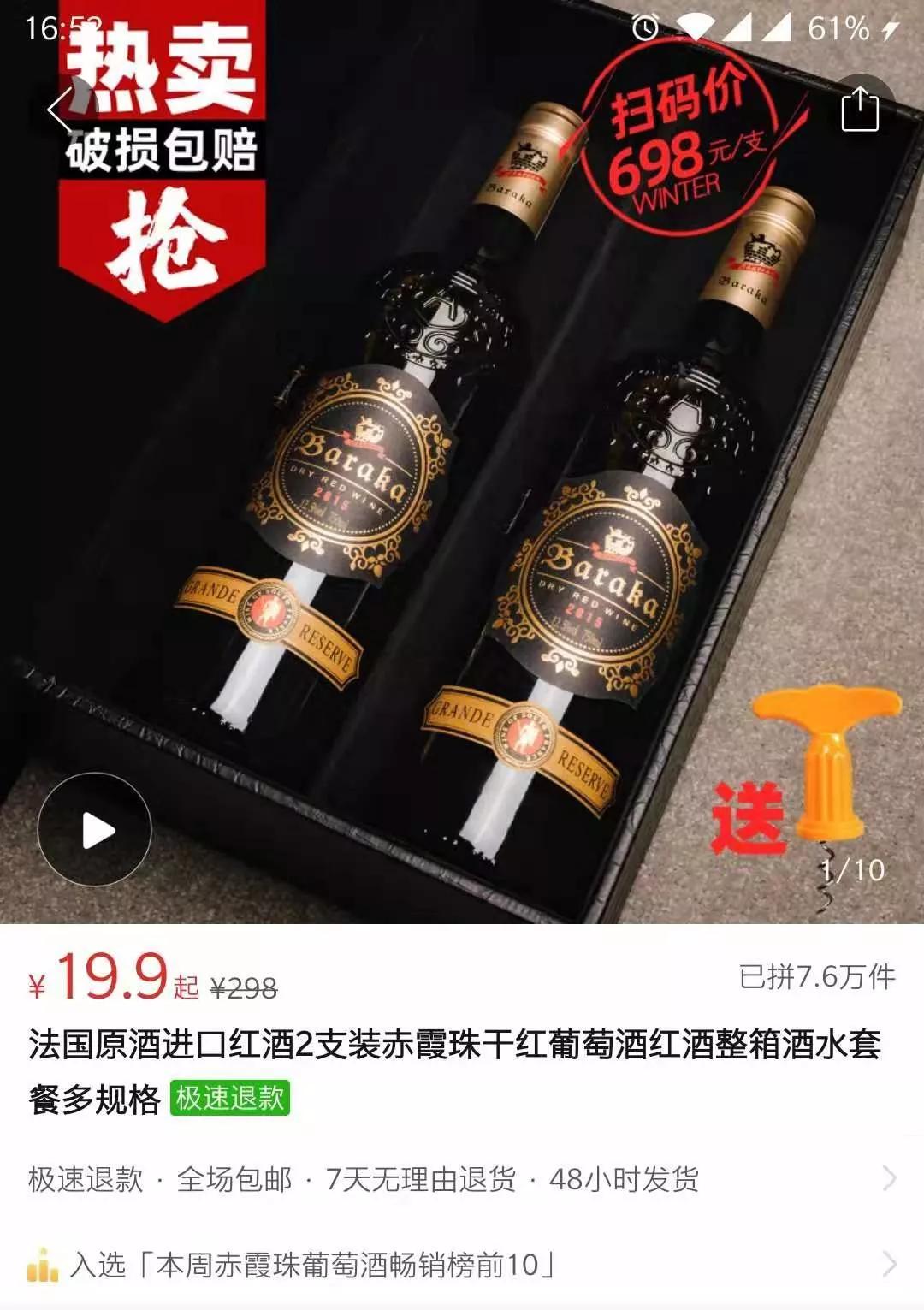 主打“下沉”市場的拼夕夕,“葡萄酒”品類熱銷7.5萬件的是19.9元2瓶還送皮盒的灌裝酒。但凡有葡萄酒常識的消費者都能想到,除掉包裝、物流、人工,還能有毛利,得是多么劣質(zhì)的酒液,才能做出不到10塊錢的售價。