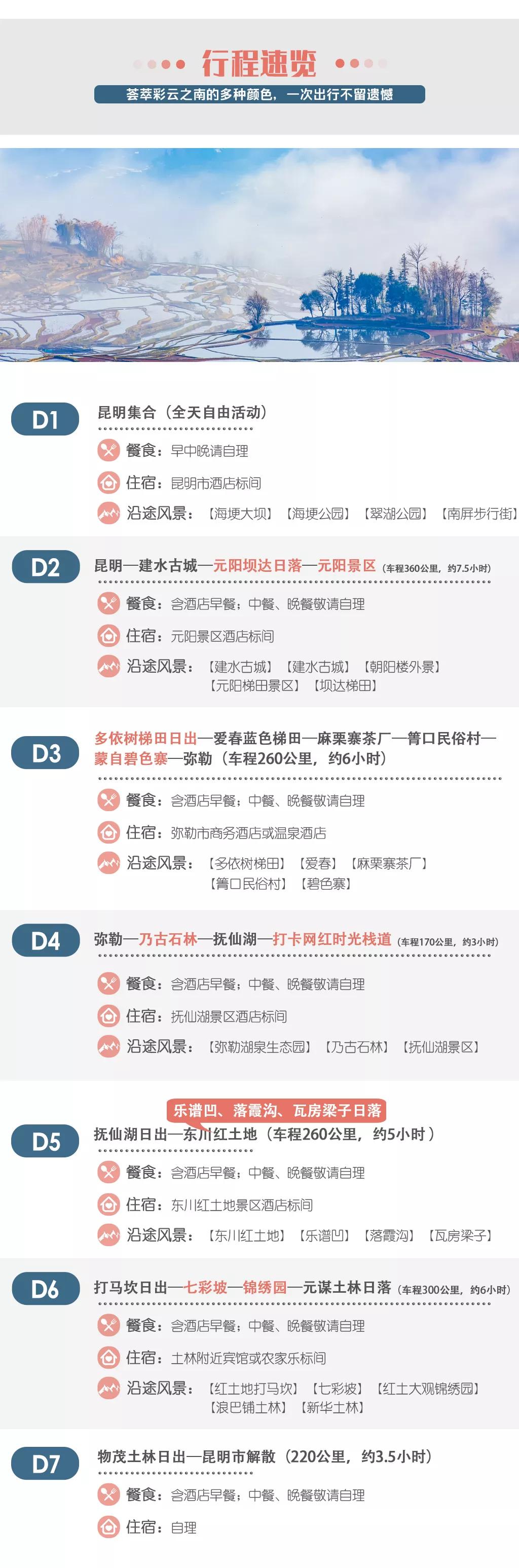當(dāng)日行程:早晨出發(fā)前往【紅土地打馬坎】觀賞磅礴日出,之后到達【七彩坡】、【紅土大觀錦繡園】進行拍攝;