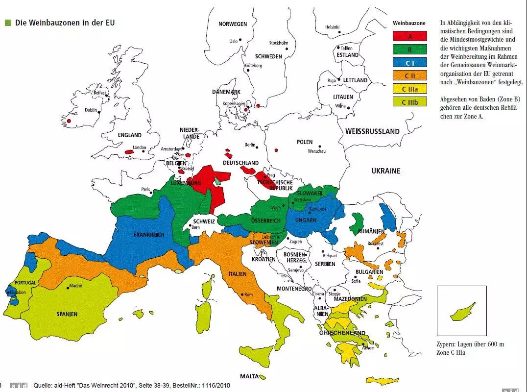 ▲ 依據(jù)氣候差異,歐洲葡萄種植區(qū)被劃分為A、B、C三個大區(qū)(C區(qū)涵蓋四個次區(qū))。其中A區(qū)最為冷涼,C IIIb區(qū)最為溫暖。
