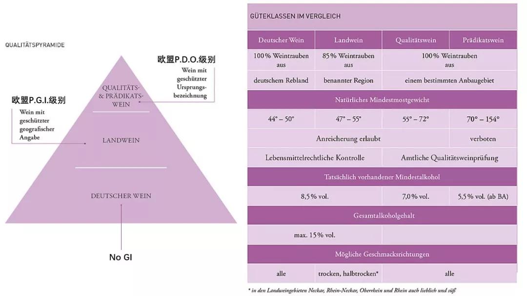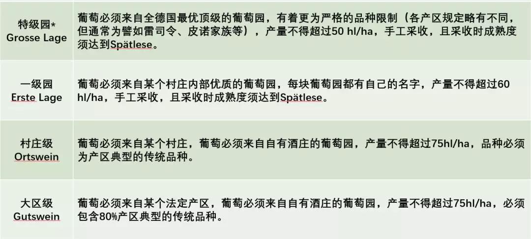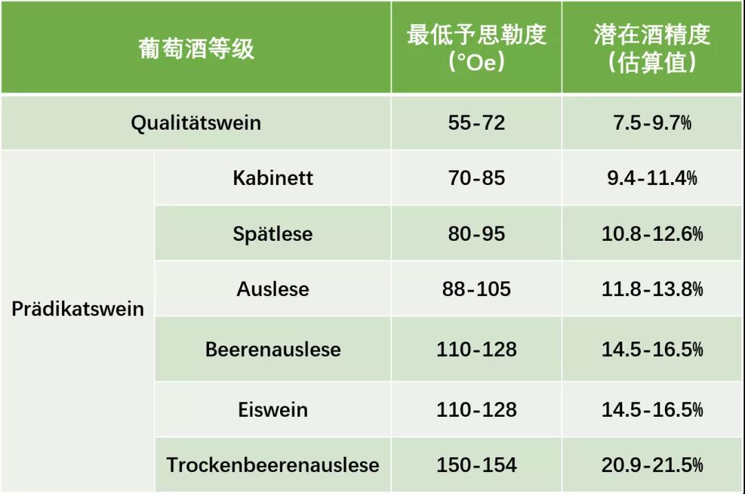 1971年,德國頒布了一套葡萄酒分級法規(guī):葡萄采收時成熟度(最低含糖量,以予思勒度°Oe)越高,對應(yīng)葡萄酒的等級就越高。