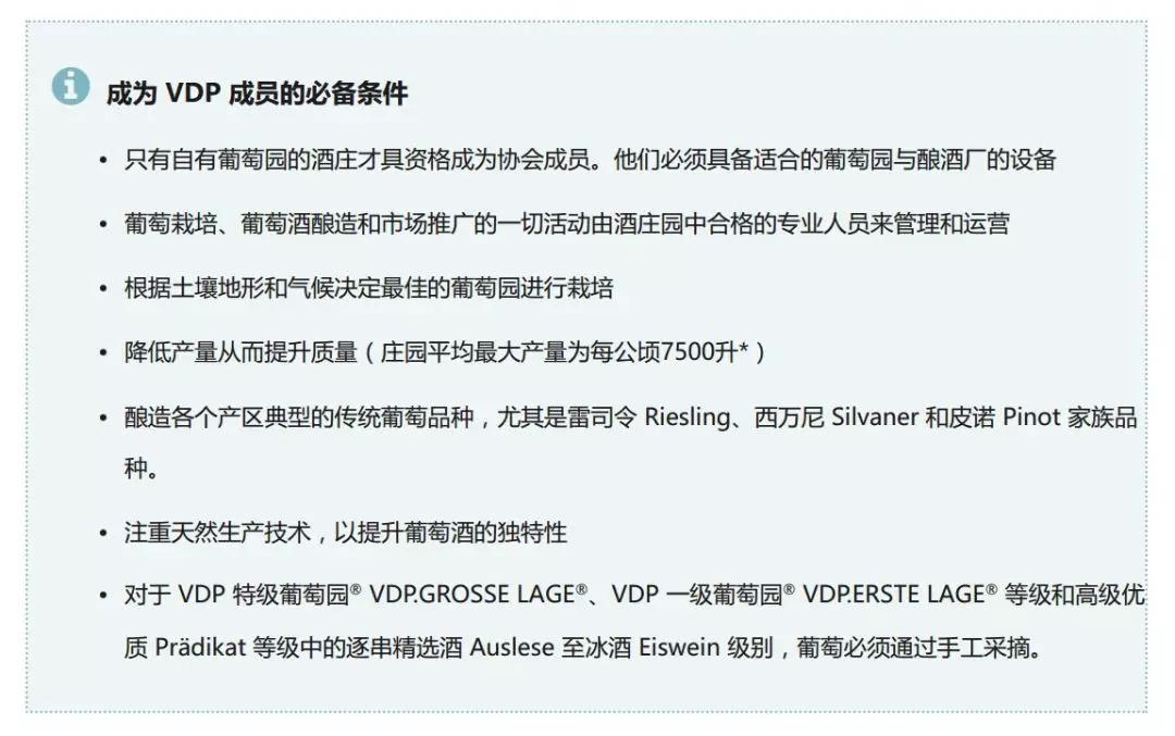 想要加入這個聯(lián)盟絕非易事。VDP聯(lián)盟實行邀請制,酒莊無法自行提出“入會”申請,只有品質(zhì)得到國際市場認可并被足夠數(shù)量的VDP成員推舉時,才可收到邀請。此外所有酒莊初次被VDP錄取認證時需通過審核,之后每5年需經(jīng)歷一次嚴苛的復(fù)審。