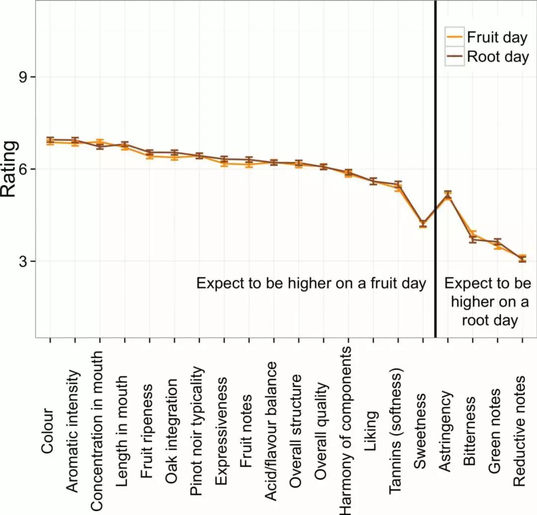“形而下”層面思考問題的人,可以進(jìn)一步去研究和探索。試想,如果擴(kuò)大實(shí)驗(yàn)酒款類別、數(shù)量的樣本量,如果改變品鑒者的背景與偏好,如果只使用自然酒,果日和根日的表現(xiàn)差異會(huì)不會(huì)出現(xiàn)不同結(jié)論?