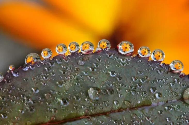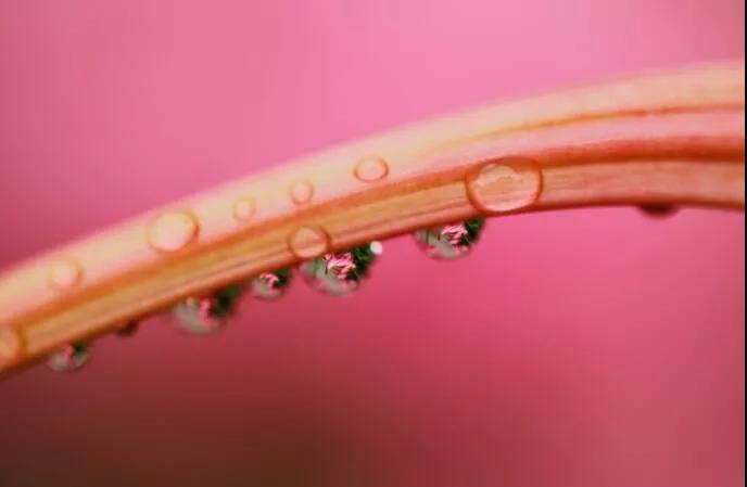 還有一種思路就是如果有針筒,也可以在這種樹葉上去噴,那么這個(gè)水滴呢,盡量噴的大小相同,然后,在背景后面再放一朵花,在水滴里面它就會有花朵的這種形態(tài),那么這個(gè)微距呢是平時(shí)最多人拍的。