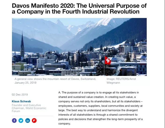 剛剛發(fā)布的2020年《達(dá)沃斯宣言》寫道:企業(yè)不僅要為股東,也要為所有利益相關(guān)者(員工、客戶、供應(yīng)商、當(dāng)?shù)厣鐓^(qū)和整個社會)服務(wù)。在細(xì)則中,“為客戶服務(wù)”是第一條,“為股東提供投資回報”則被放在最后一條。