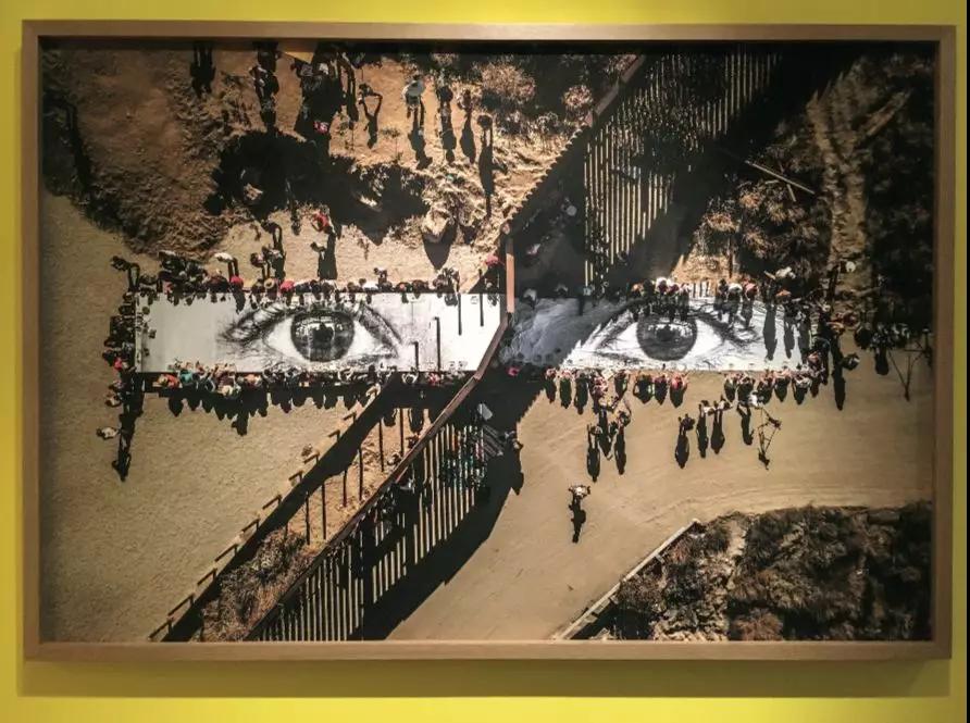 這種平靜馬上被接下來的作品打破。法國藝術(shù)家JR在 2017 年拍攝于美國與墨西哥邊境的作品《移民,梅拉,穿越邊境的野餐》(Migrants, Mayra, Picnic Across the Border)直接以一雙眼睛和觀眾對視。照片從空中俯拍,應(yīng)該由無人機(jī)完成,細(xì)看之下,這雙眼睛印在一張有兩種形態(tài)的餐桌上,一種是堅硬的桌子,另一種是柔軟的桌布。桌子和桌布并未真正相接,但因為視覺和情感上的慣性,把它們看作是一張穿越了邊境的餐桌。與這張餐桌對視,有那么一刻,可以忽視墻的阻隔,只看見這些同吃同喝的人們。