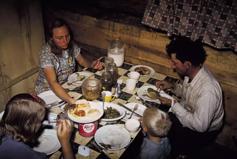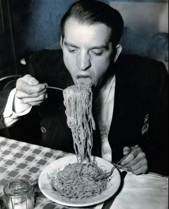 比如,維吉(Weegee)拍攝的《菲利普·斯塔佐在 WPA 上享受他最喜歡的食物,因為他聽說軍隊不太喜歡供應(yīng)意大利面》(Phillip J. Stazzone is on WPA and enjoys his favourite food as he'sheard that the Army doesn't go in very strong for serving spaghetti. 1940)以他慣常的戲劇化表達(dá)讓一副普通境界的吃相躍然紙上。維吉鏡頭下的美國在 1940年尚有一盤意大利面,拉塞爾·李(Russell Lee)在同一年份走入美國新墨西哥州的鄉(xiāng)下,便還能看見大蕭條最后的尾聲:小城市普通美國家庭并不豐盛的晚餐。20年后,同樣在美國,食物上的局促有了很大改觀,但更直觀的窘境達(dá)到了高峰: 種族問題。佚名攝影師拍下的《午餐吧臺的罷工》(Lunch Counter Sit-in) 即顯示了這個問題。兩名美國黑人大學(xué)生在“只準(zhǔn)白人” (whites-only)的餐廳吧臺上學(xué)習(xí),兩名白人女服務(wù)員在觀望他們的同時拒絕為他們服務(wù)。冰冷拒絕且?guī)猓欠浅<兇獾某鸷薇砬椤K膫€人,圍桌,卻沒有可供享用的食物。種族主義作為曾經(jīng)橫亙在他們之間無形的高墻,直到今天都還有殘垣斷壁留存,化為低矮的絆腳石。