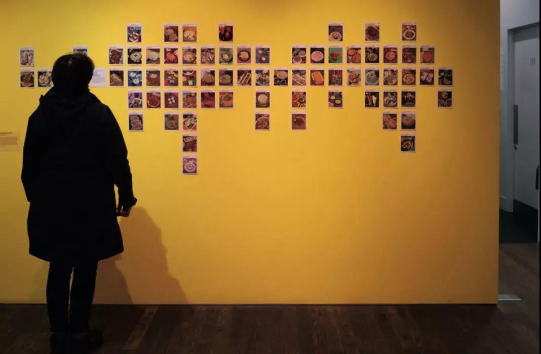 《減肥者食譜卡片》(Weight Watchers Recipe Cards, 1974)幾乎鋪滿了一整面墻。這面墻也最受觀眾歡迎,明黃底色之下,滿墻各式各樣的食物,引發(fā)熱烈討論,時而歡聲笑語,熱鬧若市,引得剛?cè)雸龅挠^眾側(cè)目。粗看之下,這就是一墻食物,細(xì)細(xì)看來往往都要吸幾口涼氣:這些食物在外形上都有超越常規(guī)審美的模樣,大多濃厚濁膩,用“黑暗料理”形容不為過,有的甚至算得上“邪典料理”……目的何在?——《減肥者食譜卡片》。理論上,減肥需要控制飲食并加強(qiáng)鍛煉,控制飲食的方法不少,遏制食欲無疑能從源頭上解決問題。于是,這些有助于遏制食欲的小卡片應(yīng)運(yùn)而生,可謂“一本正經(jīng)胡說八道”,難怪觀眾會邊看邊笑。