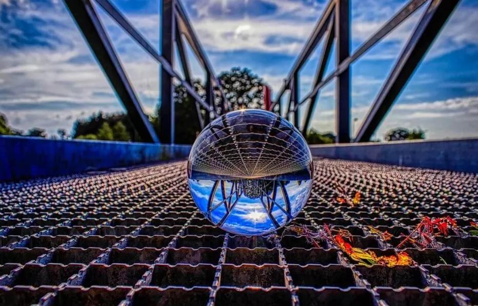 最后這張照片是利用了一個(gè)水晶球,通過了低角度拍攝有線條,有節(jié)奏的鋼鐵結(jié)構(gòu)。我們就在一些場(chǎng)景中,用水晶球去營(yíng)造一些特殊的效果,就不用后期做這個(gè)效果了。