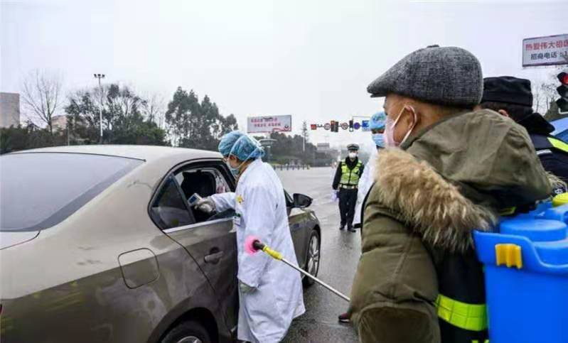 1月28日,四川省成都市龍泉驛區(qū),為了嚴(yán)防成都的過界入城車輛的疫情,龍泉驛區(qū)大面鎮(zhèn)醫(yī)院、錦江區(qū)醫(yī)院聯(lián)合公安、防疫、執(zhí)法等部門冒雨嚴(yán)防死守,檢查出入車輛及司乘人員,并對進(jìn)城車輛消毒,對人員檢測登記體溫。