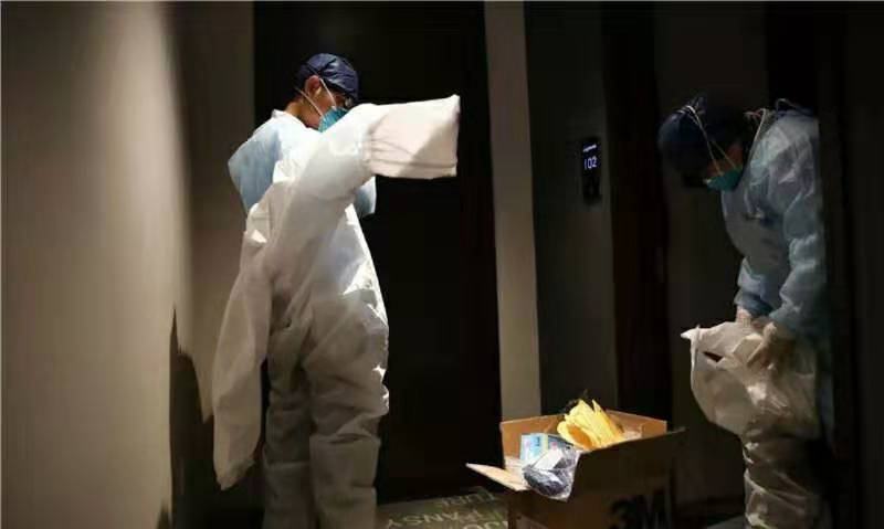 1月26日,上海一隔離點(diǎn),醫(yī)療人員在穿防護(hù)服。