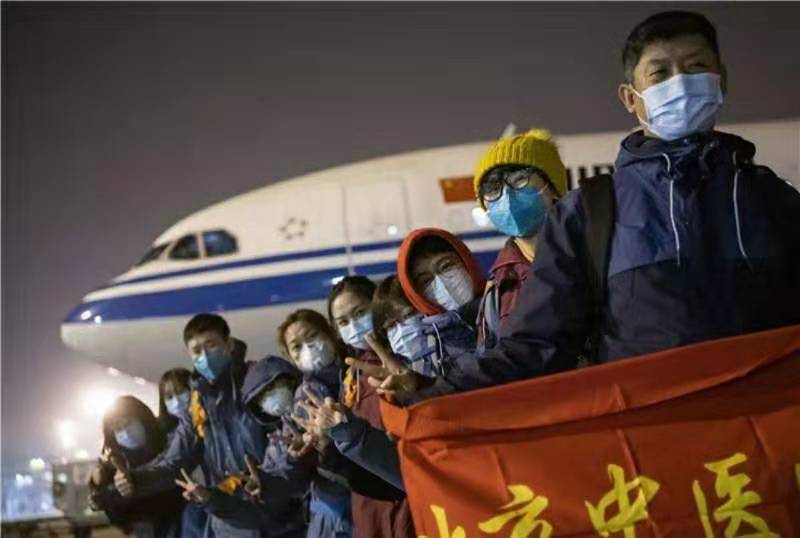 1月27日18時許,首都國際機(jī)場,北京市屬醫(yī)院援武漢醫(yī)療隊隊員合影。當(dāng)日,這支醫(yī)療隊乘坐國航包機(jī)奔赴武漢,隊員136人全部來自北京市各三甲醫(yī)院。隨同醫(yī)療團(tuán)隊一起登機(jī)的,還有武漢急需的醫(yī)療用品。