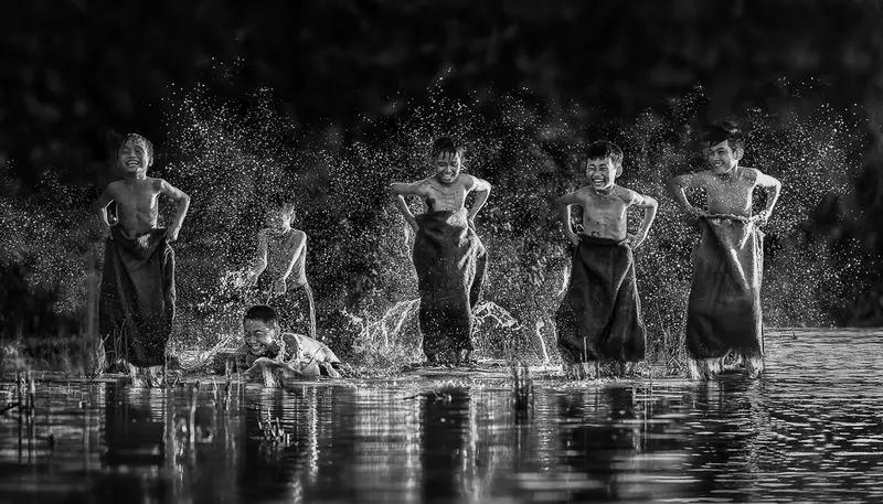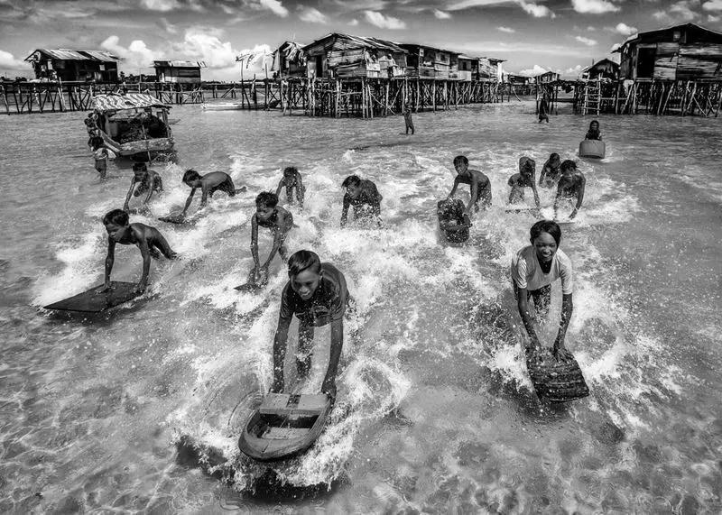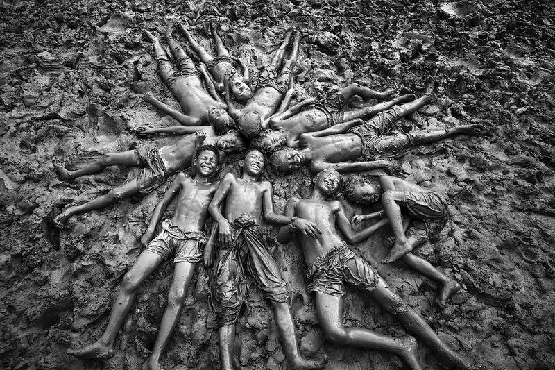 小孩拿著這個布袋在水里跳,躺在泥巴里面的這一個足球,還有泥巴中的奔牛,基本是屬于印尼的題材。所以這些照片基本很適合做低飽和度或者黑白,因為畫面有很強(qiáng)的影調(diào),而且動感很足,所以很適合用黑白表現(xiàn)這些題材。