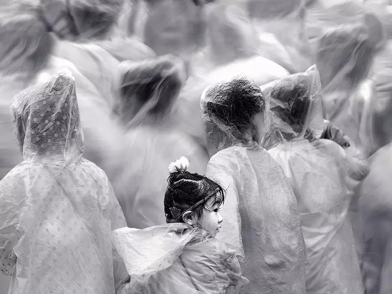 照片思路是利用了一些動靜結(jié)合的手法,這樣的拍攝手法非常值得借鑒,比如在景區(qū),看到很多人都是帶著這種雨衣的時候,可以利用動靜結(jié)合拍攝手法,利用1/4秒或者1/6秒這種快門去進(jìn)行拍攝。這個關(guān)鍵點(diǎn)就是他這個雨衣要統(tǒng)一,通過干凈的畫面柔和突出這個主體---小孩,如果說這個小孩,她是穿著其他衣服跟這個雨衣的白色形成對比也是一種思路。