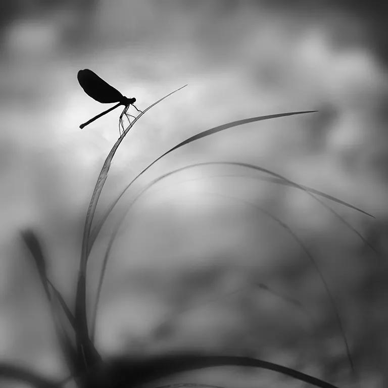照片的意境非常好,利用了這個長焦,虛化,得到一個干凈背景,然后做成黑白之后跟這個蜻蜓剪影形成一個反差,這種淡雅的黑白呢,意境還是不錯的,所以,我覺得在接下來六七月份的這個夏天,如果所有條件大家再拍荷花,拍蜻蜓的時候,可以借鑒這樣的影調(diào)手法。