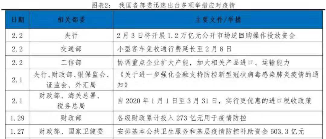疫情發(fā)生后,央行、財(cái)政部、證監(jiān)會(huì)等多部委快速出臺(tái)應(yīng)對(duì)方案,釋放穩(wěn)定預(yù)期信號(hào),對(duì)沖疫情影響,為受疫情影響的地區(qū)、行業(yè)、企業(yè)提供信貸支持,保證企業(yè)資金鏈、現(xiàn)金流的接續(xù),提振市場(chǎng)信心,維護(hù)市場(chǎng)穩(wěn)定。