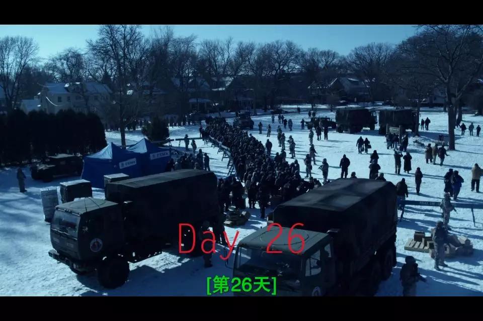 影片中疫情持續(xù)下去的情況是:在26天里,經(jīng)濟(jì)回到配給制,人們?yōu)榱祟I(lǐng)政府配給的食物排起長長的隊伍。