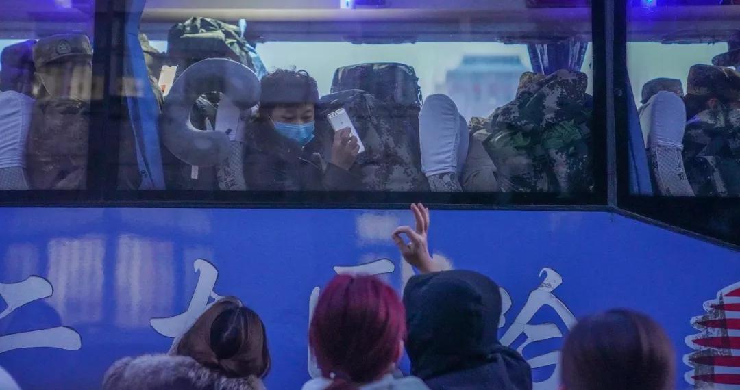 2020年1月27日下午3時許,在哈醫(yī)大二院,黑龍江省首批援助武漢醫(yī)療隊(duì)的成員們即將出發(fā)。車上的醫(yī)療隊(duì)員與家人依依惜別。