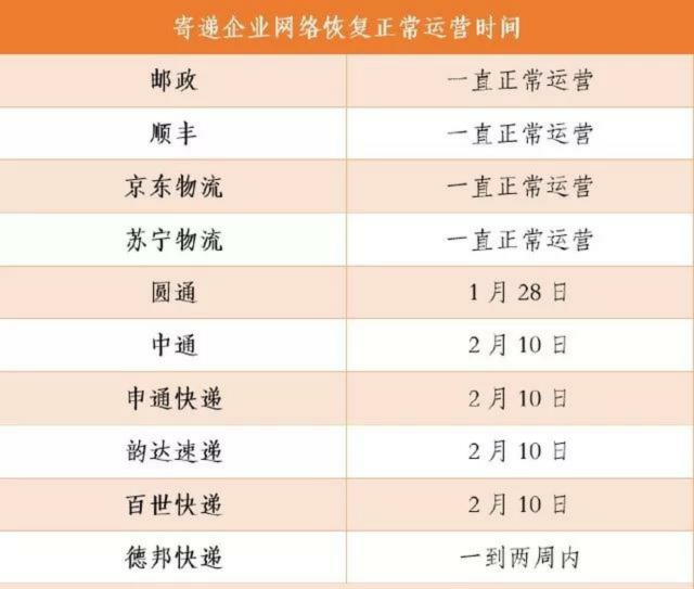 快遞公司全面復(fù)工快遞公司全面復(fù)工,但在春節(jié)和疫情期間,中國郵政、順豐速運、京東物流、蘇寧物流一直處于正常運營的狀態(tài)。中通快遞、圓通快遞、申通快遞、韻達速遞以及百世快遞等企業(yè)將從2月10日(今天)陸續(xù)恢復(fù)到正常運營模式。