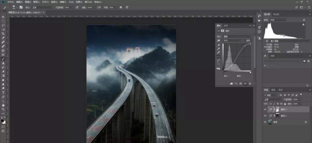 回到背景圖層,再選擇快速選擇工具(屬性中選擇添加選區(qū))選擇兩條高速路執(zhí)行曲線調(diào)整層工具,通過S型曲線調(diào)整加強高速路的反差,點擊曲線調(diào)整層蒙版滑動下羽化滑塊,稍微羽化選區(qū)。通過這一步驟調(diào)整目的是加強高速路的質(zhì)感。