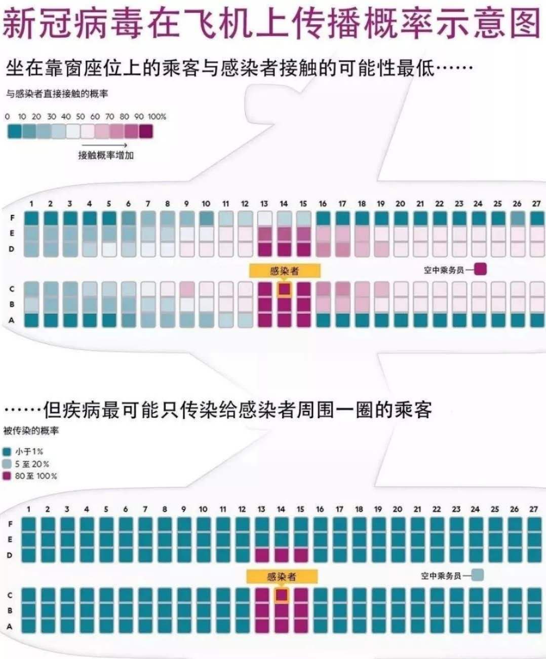 對于其他位置的乘客,危險性并不顯著,這是由于客艙空氣在橫斷面上循環(huán),飛沫的播散被限制在少數(shù)幾排座位。