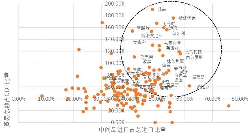 如圖所示,對國際貿(mào)易依賴程度更高、與國際供應(yīng)鏈聯(lián)系更強、且從中國進口中間品較多的國家大多都是發(fā)展中國家,幾乎沒有發(fā)達經(jīng)濟體。當然,在部分產(chǎn)業(yè)中有些發(fā)達國家和中國在生產(chǎn)和消費環(huán)節(jié)的聯(lián)系非常緊密,如電子產(chǎn)業(yè)中以中日韓為核心形成了東亞生產(chǎn)體系,汽車產(chǎn)業(yè)中德國對中國的終端需求依賴度較高。