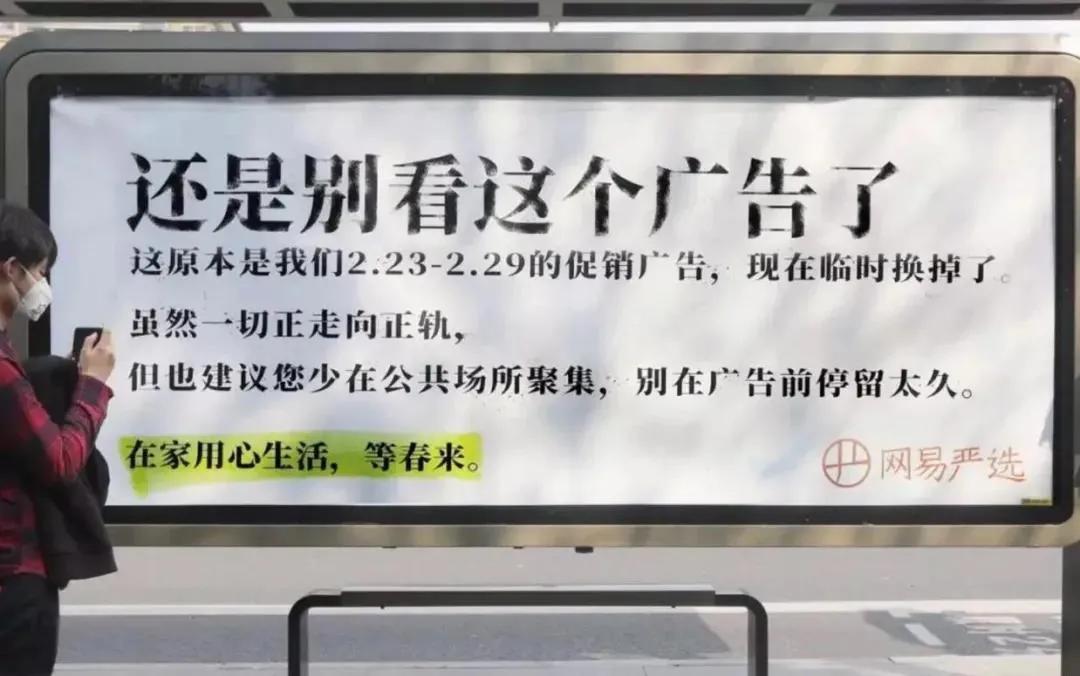 近日,在某中心商場(chǎng)附近的網(wǎng)易嚴(yán)選特殊戶(hù)外廣告“還是別看這個(gè)廣告了”刷屏。廣告牌上寫(xiě)著:“還是別看這個(gè)廣告了,這原本是我們2.23-2.29的促銷(xiāo)廣告,現(xiàn)在臨時(shí)換掉了。雖然一切正走向正軌,但也建議您少在公共場(chǎng)合聚集,別在廣告前停留太久。在家用心生活,等春來(lái)。”網(wǎng)易嚴(yán)選將廣告作為溫馨提醒,勸用戶(hù)不要看,不要聚眾,既展現(xiàn)了創(chuàng)意又傳遞了溫度。