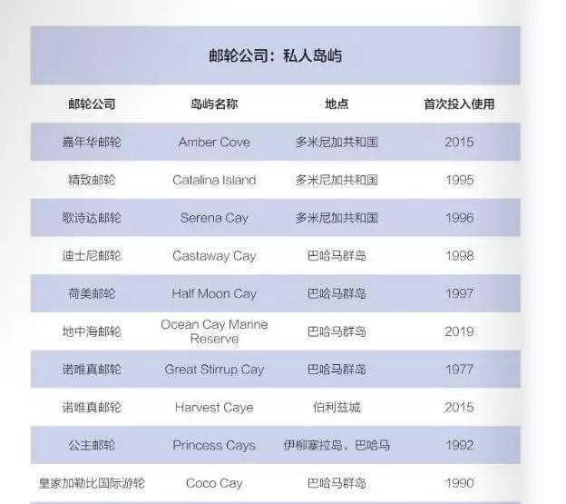 郵輪公司的私人島嶼幾家經(jīng)營(yíng)巴哈馬/加勒比海航線的郵輪公司都設(shè)有“私人島嶼沙灘日”行程。諾唯真郵輪在1977年購(gòu)買了一個(gè)此前為軍事哨所的島嶼,引領(lǐng)了郵輪公司購(gòu)買私屬島嶼的新趨勢(shì)。到目前為止,諾唯真已經(jīng)花費(fèi)數(shù)百萬(wàn)美元用于升級(jí)島上設(shè)施。