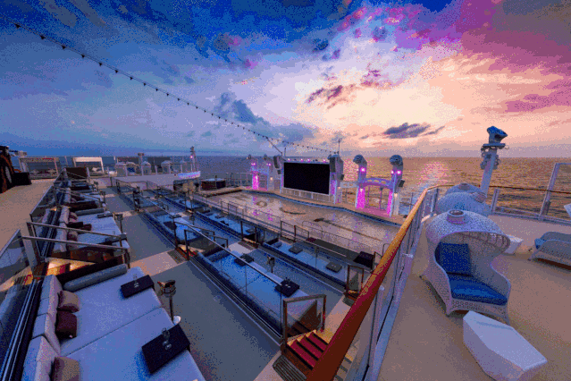 甲板上,有高空飛索表演,有海上煙花匯演,你可以在各式各樣的休閑、娛樂、美食、購物場景中獲得無數(shù)與眾不同的美好體驗,當(dāng)然,你也可以什么都不體驗,只是吹著海風(fēng)看看世界。