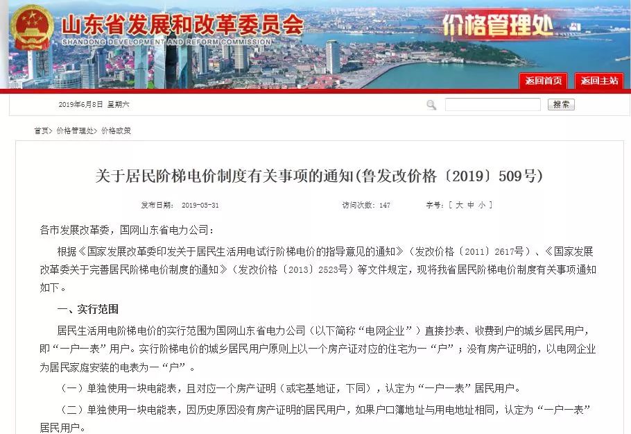 省發(fā)改委發(fā)布了《關于居民階梯電價制度有關事項的通知》(魯發(fā)改價格〔2019〕509號)