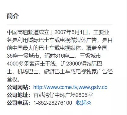中國高速頻道(CCME)是一家以豪華大巴為媒介,通過提供車載視頻為乘客提供視聽節(jié)目和廣告咨詢的公司。