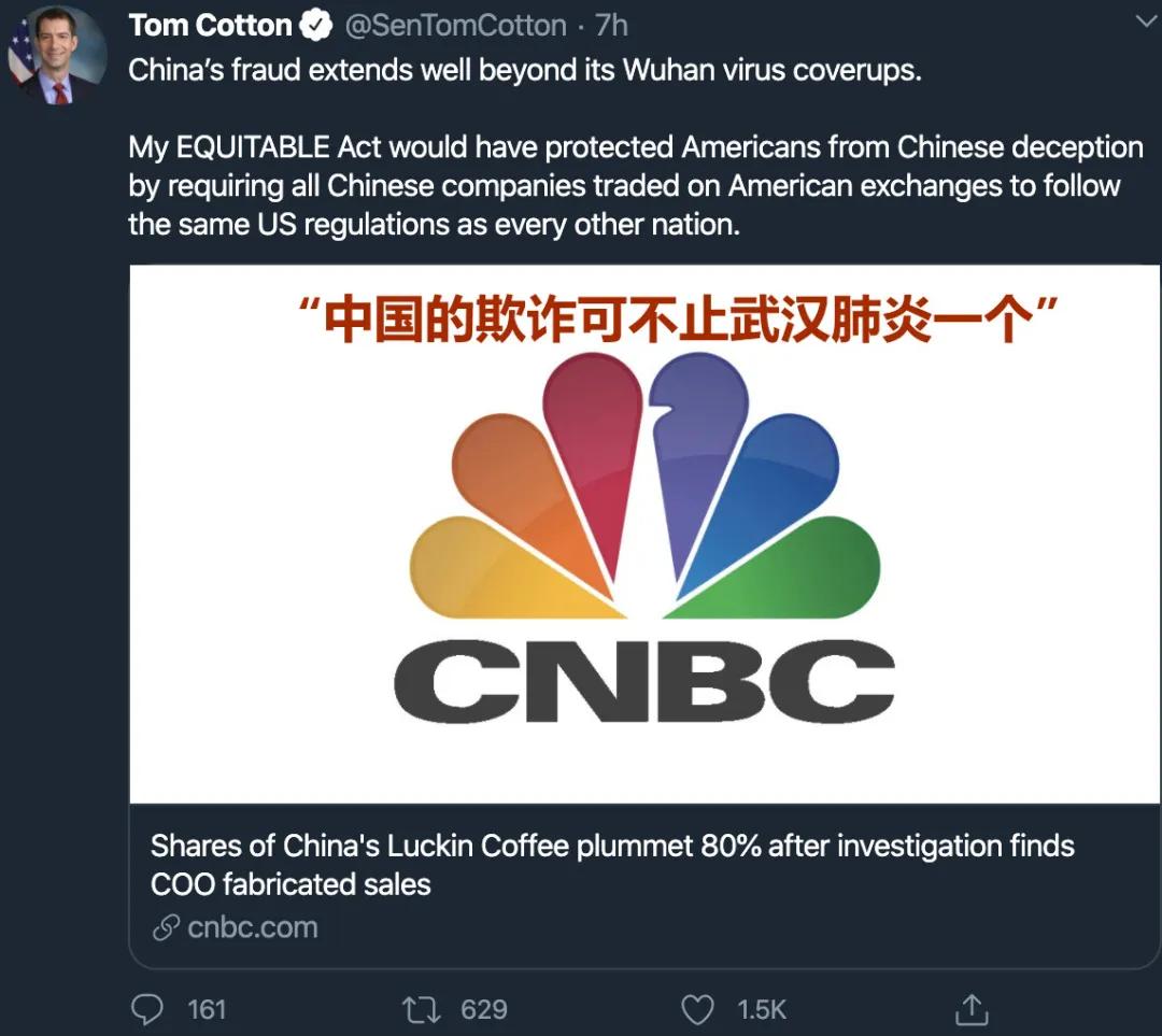 但是美國一個反華參議員囂張地轉(zhuǎn)載了瑞幸事件的新聞,配文說“中國的欺詐行為遠不止武漢肺炎”。