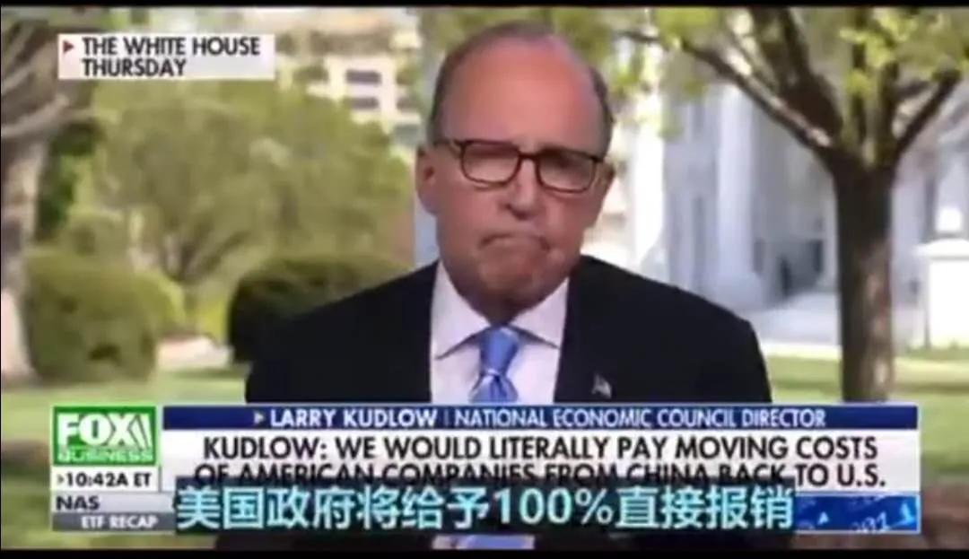 據(jù)“環(huán)球時(shí)報(bào)”綜合路透社、彭博社的報(bào)道,美國(guó)白宮的國(guó)家經(jīng)濟(jì)委員會(huì)主任拉里·庫(kù)德洛(Larry Kudlow)建議,通過(guò)“報(bào)銷全部費(fèi)用”的方式,吸引美國(guó)企業(yè)從中國(guó)遷回美國(guó)。
