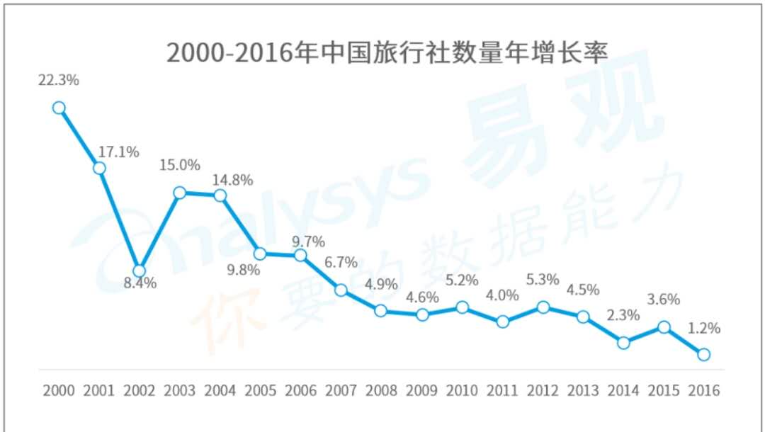 根據(jù)中國旅行社協(xié)會(huì)《2018年中國旅行社行業(yè)發(fā)展年度報(bào)告》數(shù)據(jù)顯示,2016年中國旅行社數(shù)量年增長率僅為1.2%,線下旅行社增速持續(xù)放緩。國內(nèi)旅行社目前發(fā)展定位不明確,產(chǎn)品同質(zhì)化現(xiàn)象嚴(yán)重。