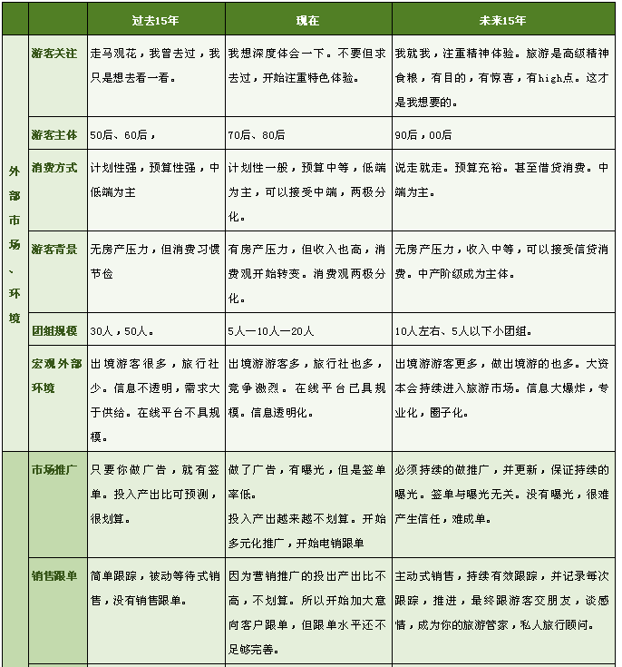 請看以下的分析,從外部環(huán)境,游客主體,產品趨勢,等幾個方面,綜合對比過去十五年,現(xiàn)在,和未來十五年的一個變化和趨勢。