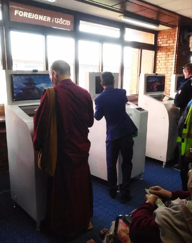 在“VISA APPLICATION”的指引牌的引導(dǎo)下,你就會(huì)發(fā)現(xiàn)很多臺(tái)下圖的申請(qǐng)落地簽的電子設(shè)備,正常的機(jī)器屏幕上會(huì)顯示“Welcome to the Department of Immigration,Nepal",根據(jù)屏幕指示點(diǎn)擊進(jìn)入到下一個(gè)環(huán)節(jié)!