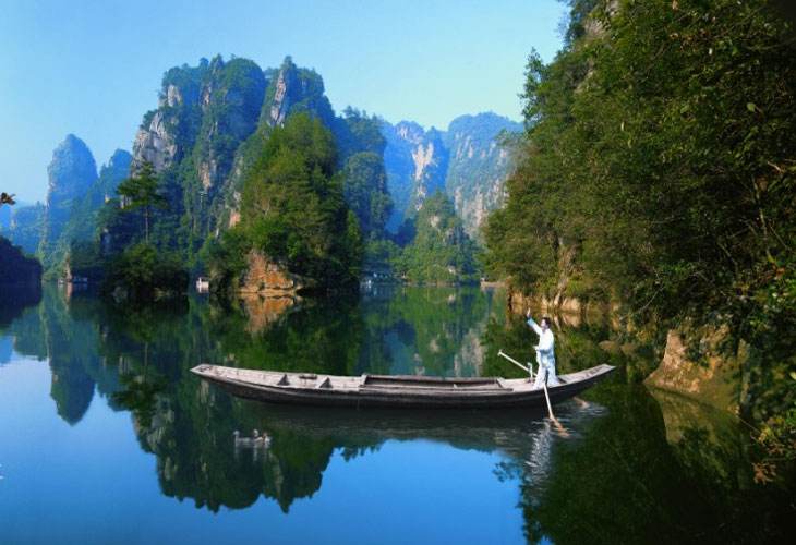 是一個截流筑壩而成的人工湖,精華景點有玉瓶開花、十女梳妝、金龜戲水、青娃鬧春等等,是武陵源景區(qū)惟一玩水的游覽景點,也是一個山水結(jié)合的旅游點。