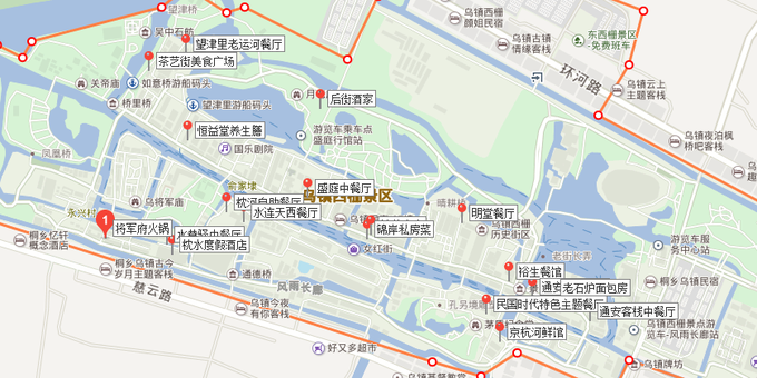 由于西柵在面積上比東柵大很多,所以西柵會有更多空間來容納更多美食。僅烏鎮(zhèn)官方推薦的餐館就有圖上標注的這些。
