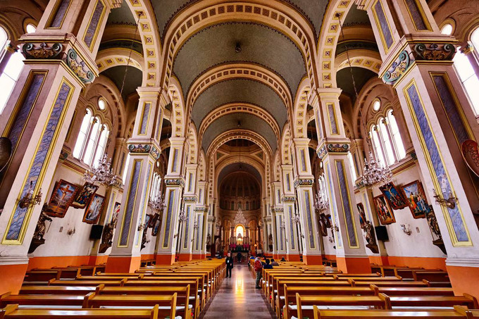 教堂外部用紅黃相間花磚砌成,三座呈品字形排列、高聳入云的塔樓上浮蓋著綠色銅片,塔樓頂上各有一個青銅十字架。走進教堂,映入眼簾的首先是湖藍、白色、淡黃構(gòu)成的內(nèi)部主色調(diào),給人一種清新的感覺,14根立柱從門口排列到祭臺。教堂四周列著一座座精美的教徒銅像,墻壁上則掛著一幅幅記述耶穌受難故事的油畫,教堂內(nèi)還有圣母、耶穌、天使等的彩色塑像。