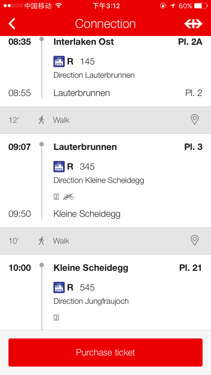 第一段小火車(chē)有兩條路線(xiàn),分別在2A和2B站臺(tái),呈環(huán)形路線(xiàn),上山和下山乘坐不同路線(xiàn)。夏季(4.28~10.26)每半小時(shí)一班,冬季每一小時(shí)一班。線(xiàn)路1:Interlaken Ost-Lauterbrunnen;線(xiàn)路2:Interlaken Ost-Grindelwald。