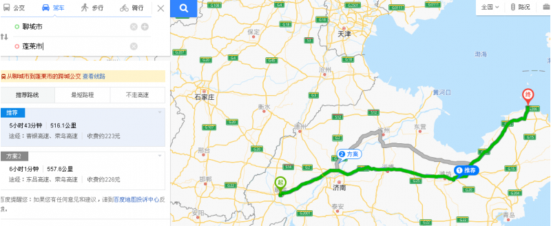 D1:聊城——煙臺(tái)蓬萊(516.1公里,大約6小時(shí)左右)