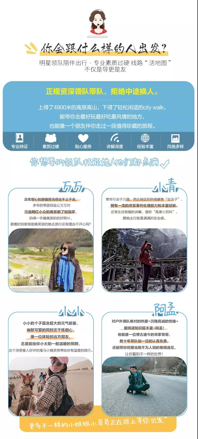 私人訂制:我們業(yè)務(wù)范圍囊括了全國(guó)各大城市,川西、西北、東北,在路上永遠(yuǎn)有我們的身影。我們將為每一個(gè)有定制需求的你策劃出獨(dú)屬于自己的完美旅行。