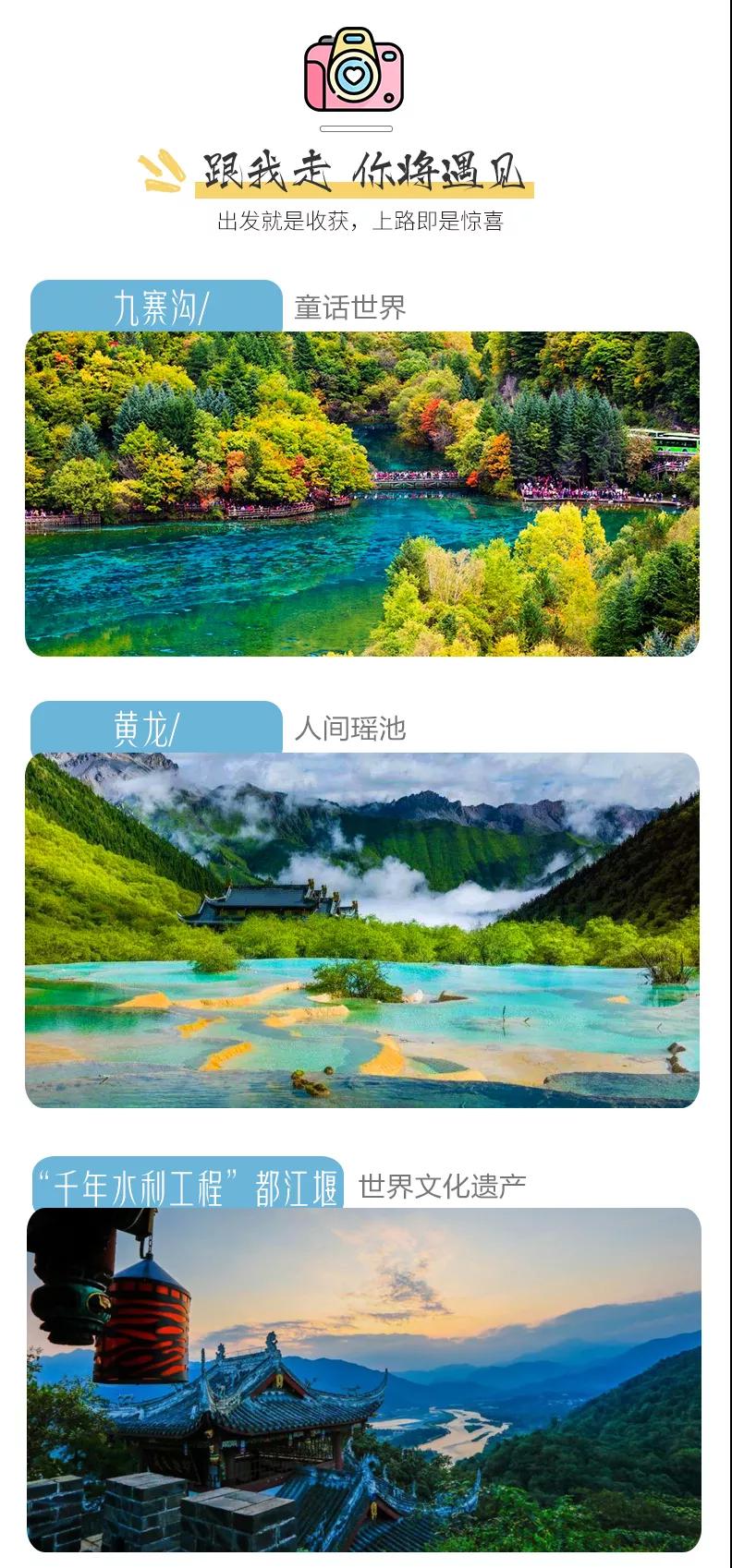 門(mén)票:九寨溝門(mén)票、黃龍風(fēng)景區(qū)門(mén)票、成都熊貓基地門(mén)票、武侯祠門(mén)票、都江堰門(mén)票;