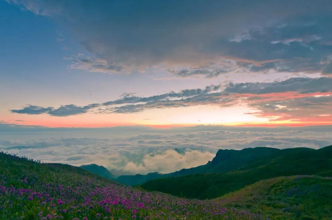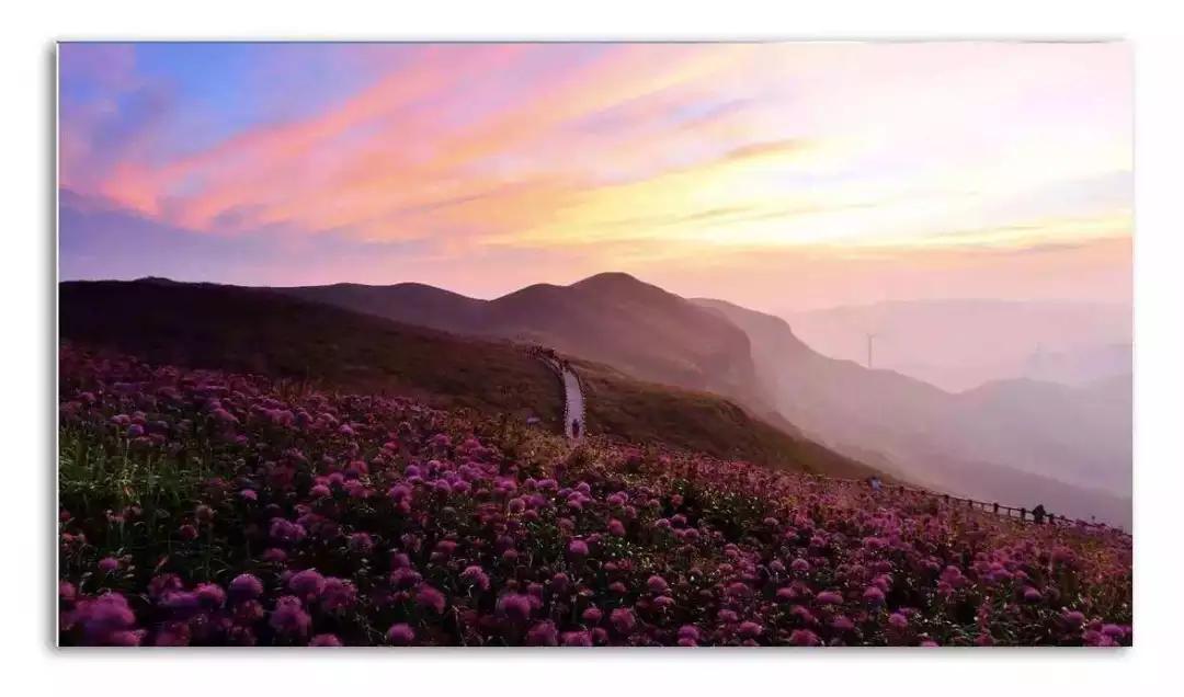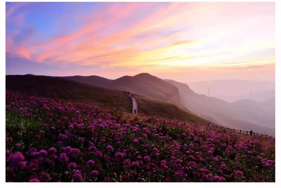 今天我們驅(qū)車來(lái)到云上花海的韭菜坪山腳下,為了能欣賞到韭菜坪最美的日出景象,我們把重頭戲放到了第二天一早,而今天大家在山下游玩拍照,這里盛開著一望無(wú)際紫色的馬鞭草 ,也可以上山去拍一個(gè)日落霞光哦。