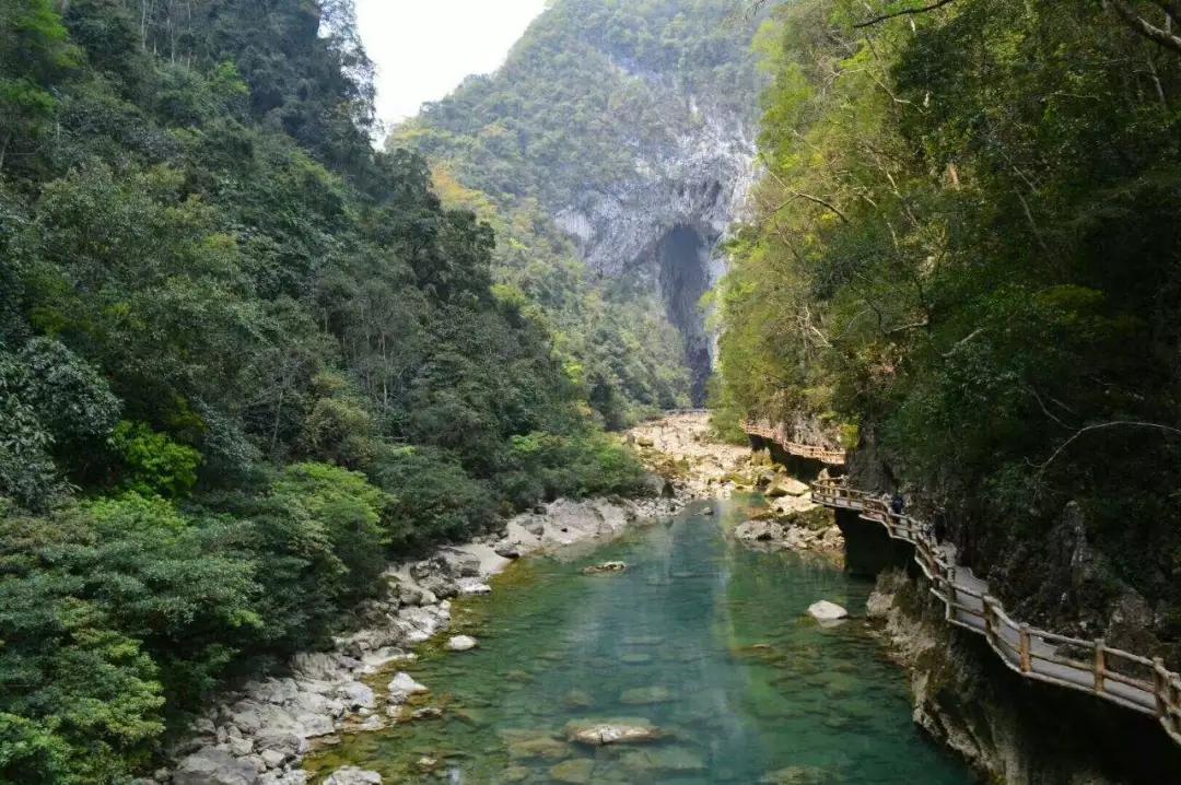 下午:后乘車前往游覽國(guó)家AAAAA級(jí)景區(qū)【大七孔】(游玩時(shí)間不少于2小時(shí));大七孔是以原始森林、峽谷、伏流、地下湖為主體的景區(qū),沿著恐怖峽打狗河直下,可見(jiàn)吊橋,右邊的棧道一面靠山,一邊臨水,蜿蜒曲折,凹凸不平。最為震撼的還是走過(guò)棧道的三分之二處,有一橫跨河兩岸的天然巨巖,是喀斯特是貌奇觀之一,俗稱天生橋,被專家們譽(yù)為“大自然神力所塑的東方凱旋門(mén)”,仰觀橋孔下,只見(jiàn)巨型鐘乳懸掛,橋腳、橋側(cè)的裂隙石縫長(zhǎng)出綠石草叢灌木,藤蘿花卉纏裹橋身,真是滿目琳瑯、五顏六色的天然大彩橋。