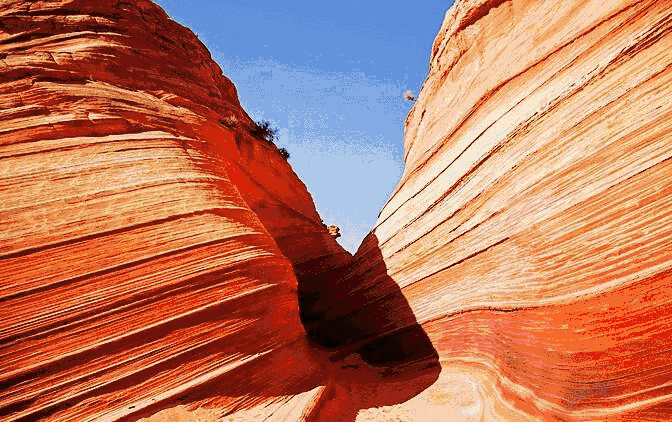 美西和陜北波浪谷,都是古老的沙丘隨著平原的上升,加上漫長(zhǎng)的風(fēng)蝕,水蝕,峽谷里砂巖的層次逐漸清晰地呈現(xiàn)出來(lái)。平滑的,雕塑感的砂巖和巖石上流暢的紋路創(chuàng)造了一種令人目眩的三維立體效果。二者也有一定區(qū)別,美西波浪谷在紅色之間夾有白色線條,紅白相間;而陜北波浪谷則以紅色為主。