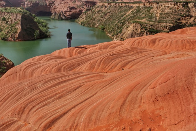 波浪谷景區(qū)位于陜西省靖邊縣城東南22公里處的龍洲鎮(zhèn),是典型的盆地型峽谷,這里紅巖環(huán)繞,綠水縈繞,方圓百公里都被紅色砂巖所覆蓋,與美國(guó)亞利桑那州的波浪谷非常相似, 亞利桑那州波浪谷紅色之間夾有白色線條, 靖邊波浪谷則以紅色為主。